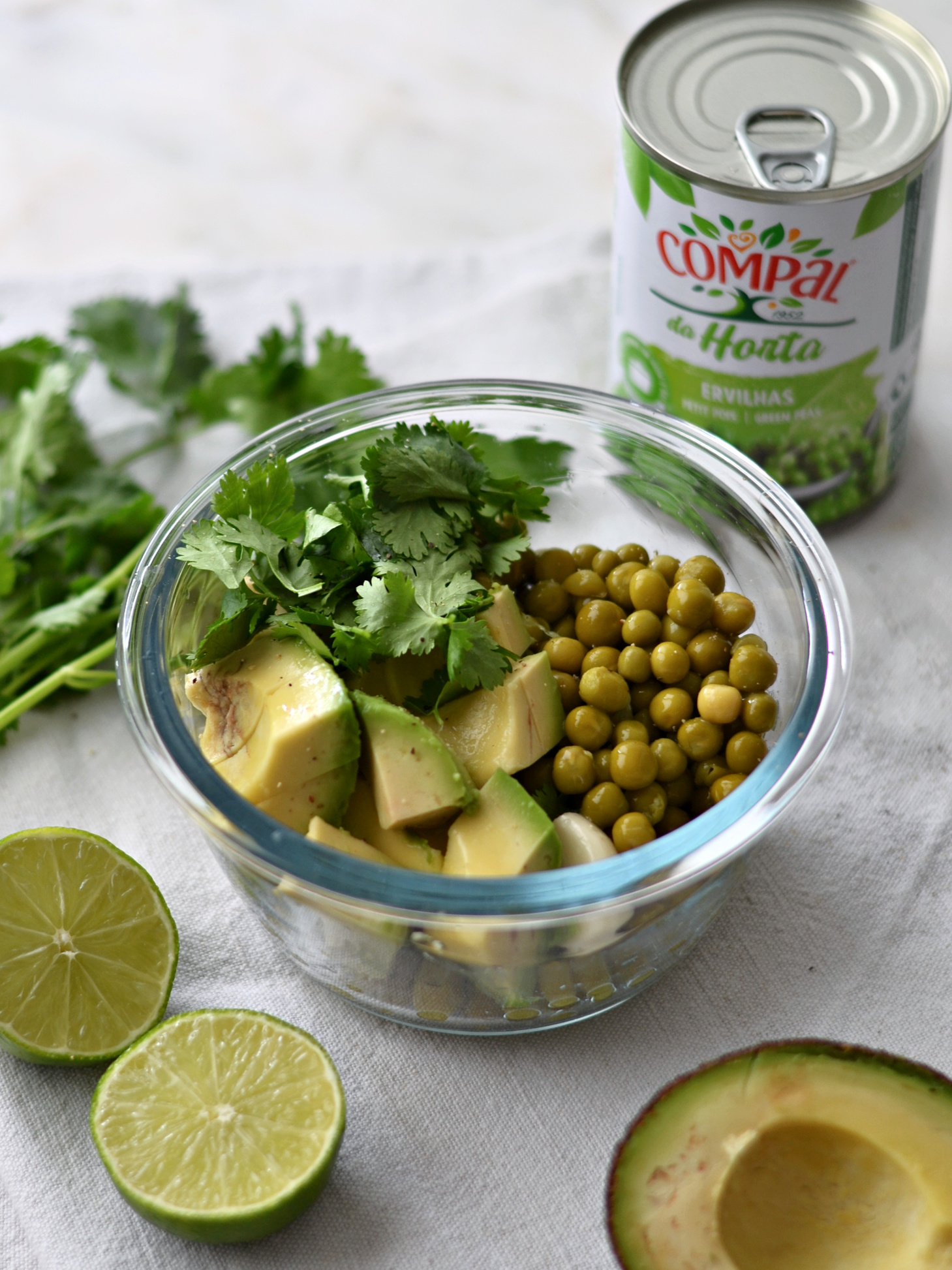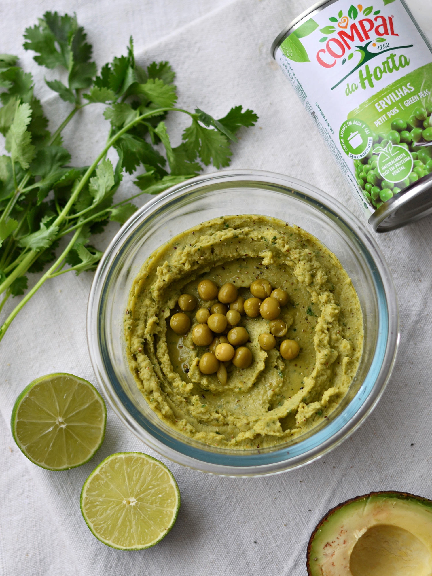 • Reservar algumas ervilhas para o empratamento. Triturar no processador de alimentos as ervilhas, e juntar o abacate, o sumo de lima, o alho, os coentros, e a pimenta preta. Adicionar, conforme necessário, 1 a 2 colheres de sopa de água, até que seja atingida uma consistência cremosa.